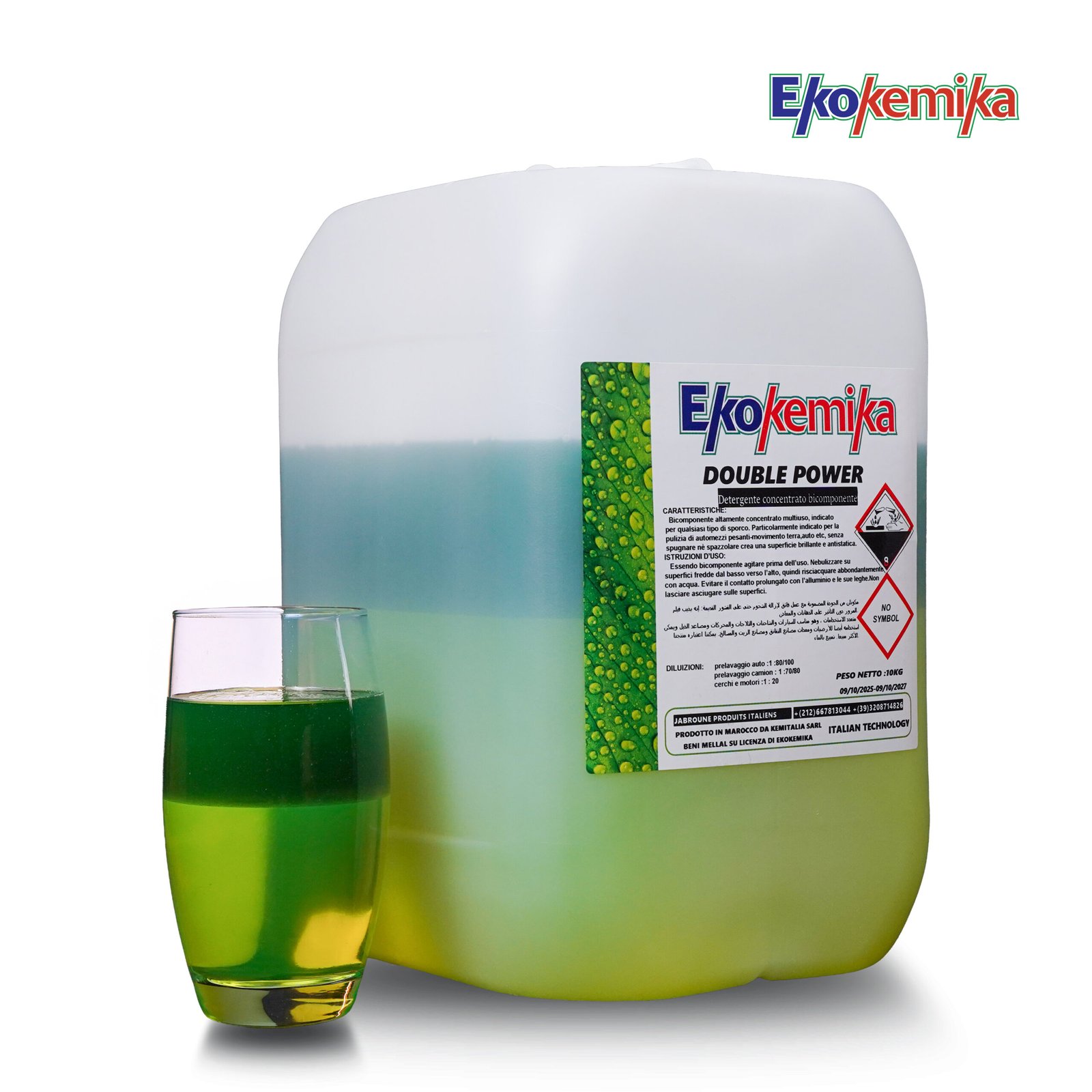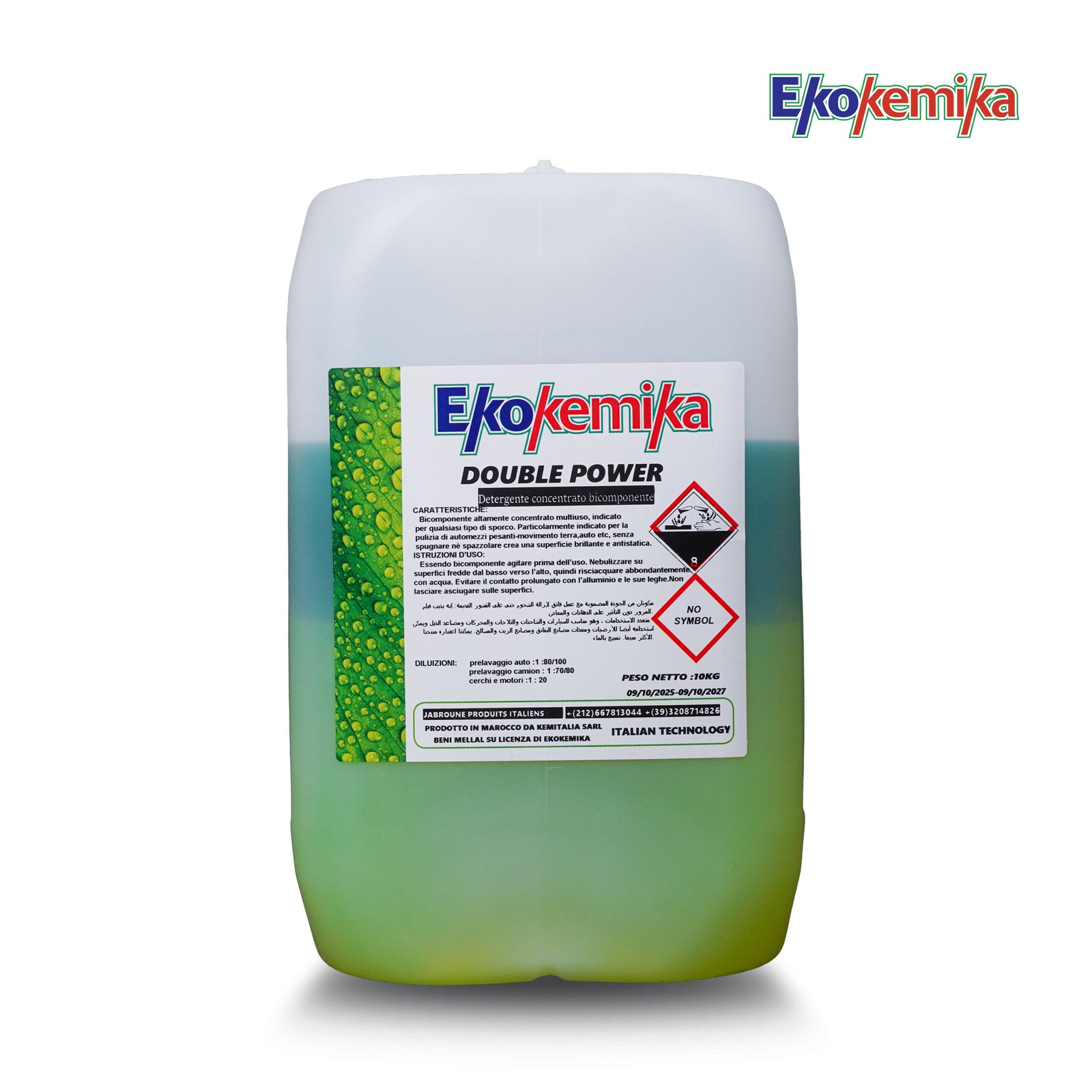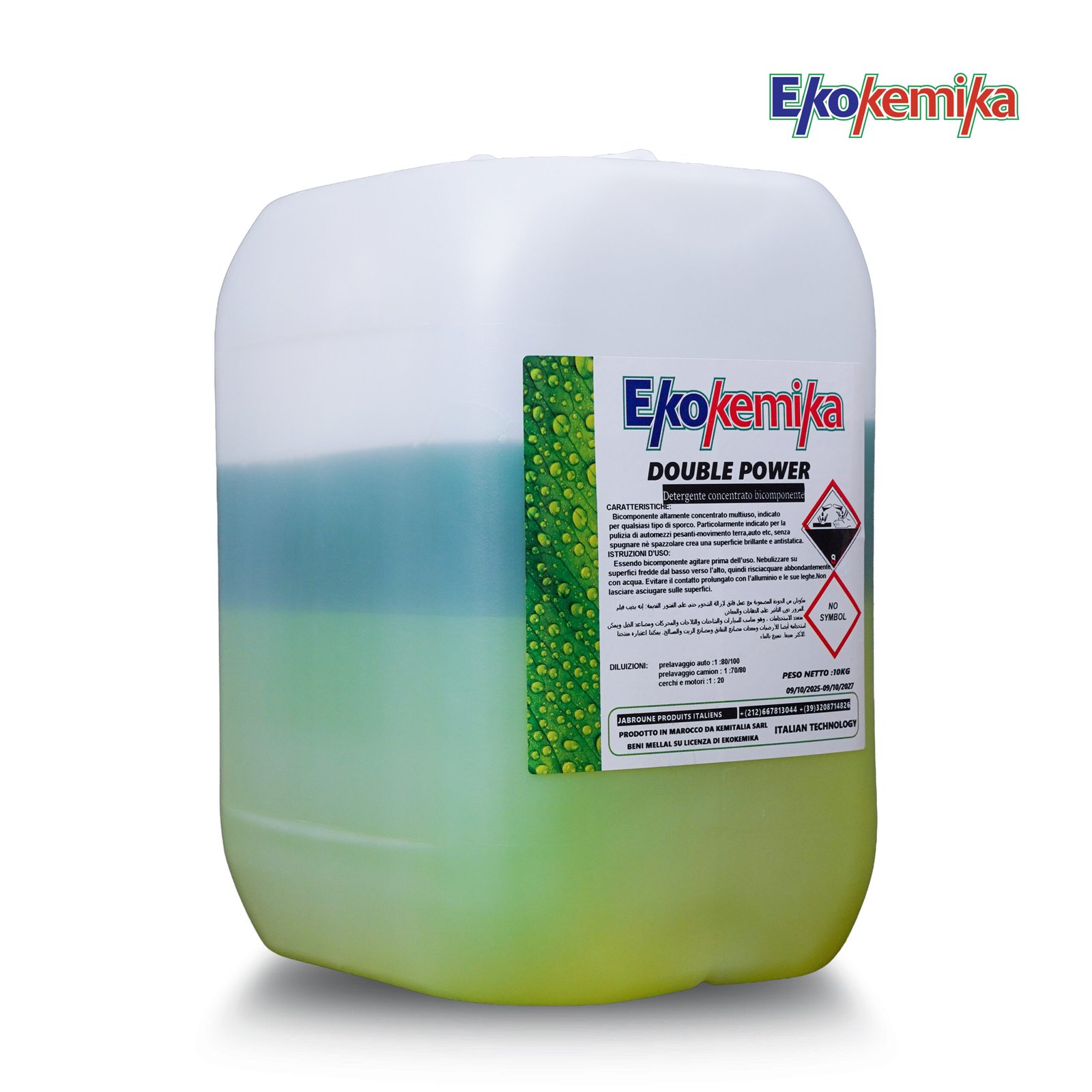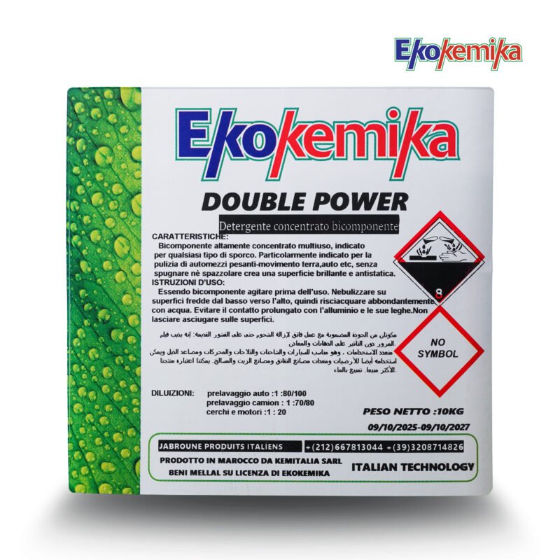 Ekokemika DOUBLE POWER est un détergent concentré bicomposant à très haut pouvoir nettoyant, destiné au prélavage professionnel des voitures et des camions. Il élimine efficacement les saletés lourdes et incrustées tout en laissant une surface propre et brillante. Poids net : 10 kg.