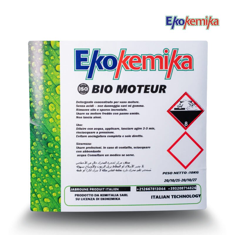 Ekokemika BIO MOTEUR est un détergent concentré spécialement conçu pour le nettoyage du compartiment moteur. Il élimine efficacement les graisses, huiles et saletés incrustées sans endommager les câbles, plastiques ou caoutchoucs, et ne laisse pas de traces après rinçage. Poids net : 10 kg.