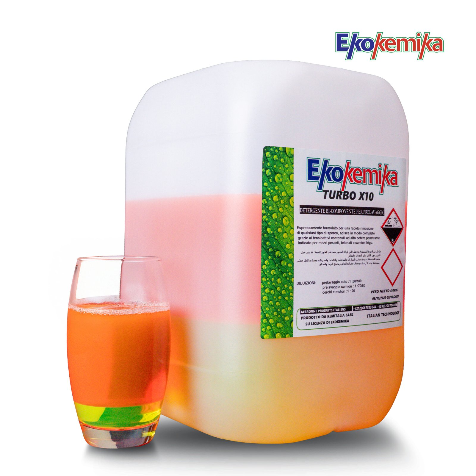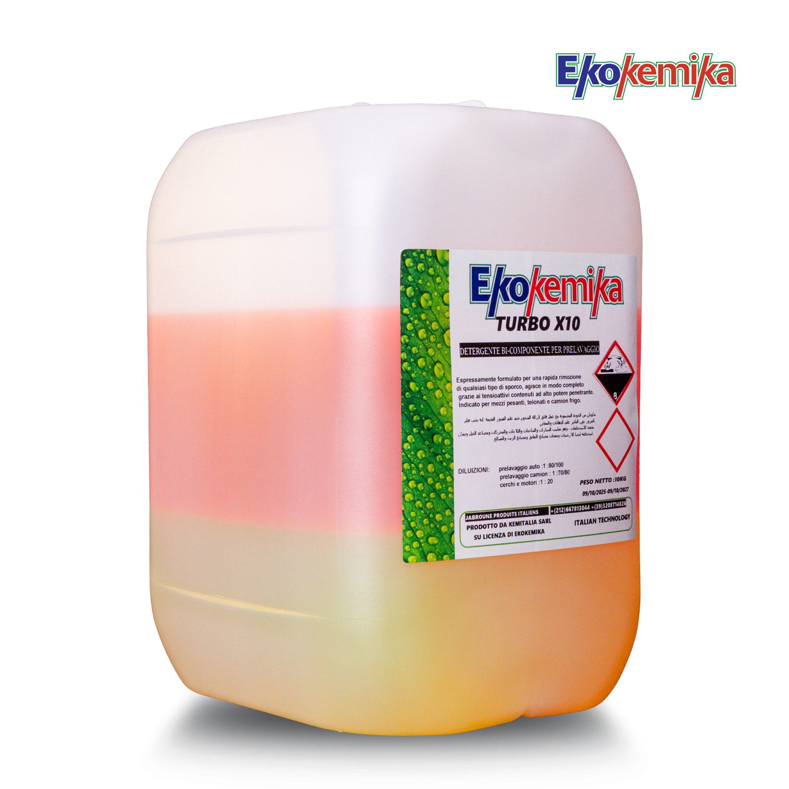Ekokemika TURBO X10 est un détergent bicomposant haute performance spécialement formulé pour le prélavage professionnel des véhicules. Il agit rapidement sur les saletés lourdes et incrustées grâce à son fort pouvoir pénétrant, tout en respectant les surfaces. Poids net : 10 kg.