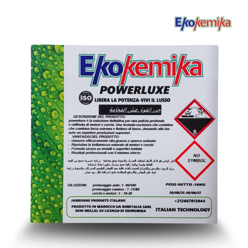 Ekokemika POWERLUXE est un détergent professionnel haute performance conçu pour le nettoyage en profondeur des moteurs, jantes et surfaces très encrassées. Sa formule puissante élimine efficacement huiles, graisses et saletés tenaces, tout en offrant une finition propre et brillante. Poids net : 10 kg.