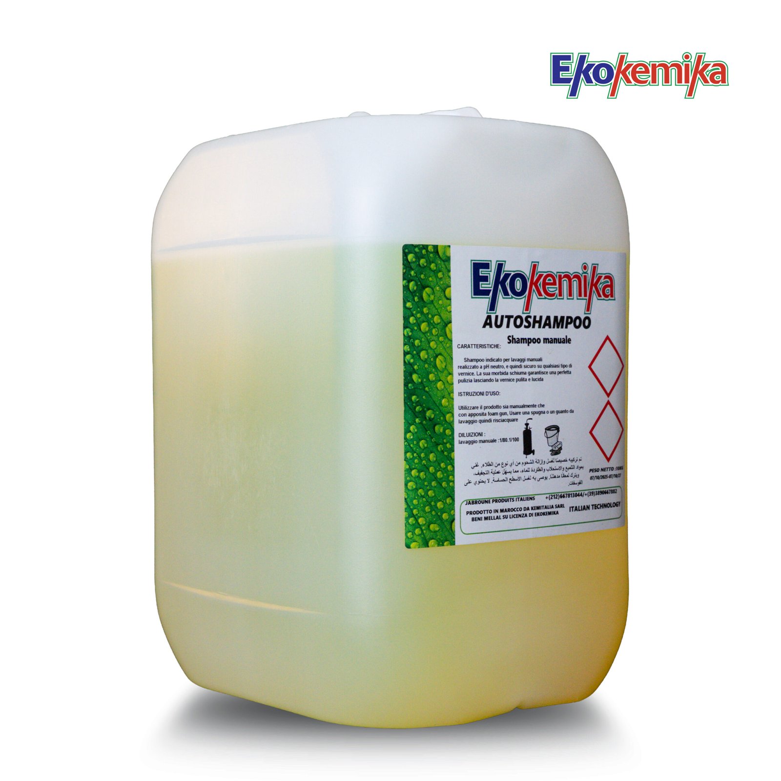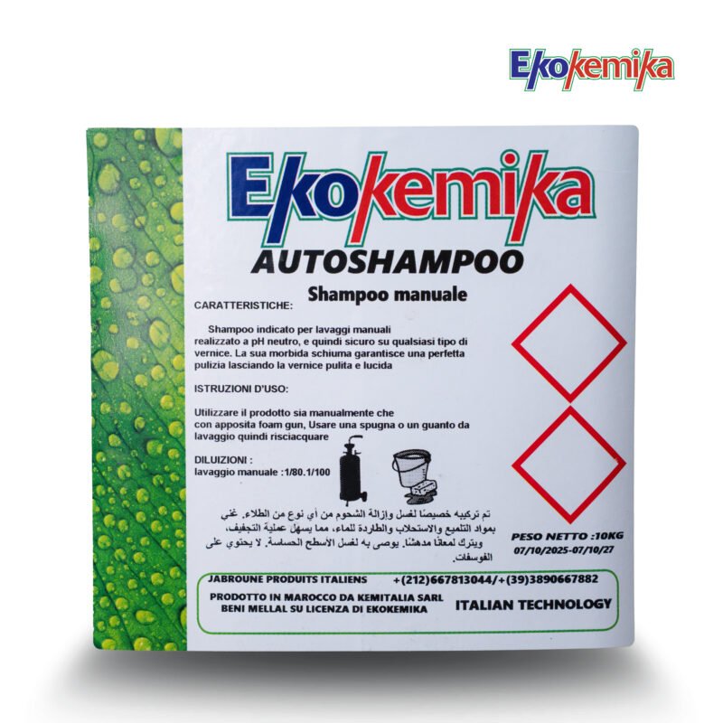 Ekokemika AUTOSHAMPOO est un shampooing manuel professionnel à pH neutre, conçu pour le lavage à la main des véhicules. Sa mousse douce nettoie efficacement tout en respectant la peinture, laissant une finition propre et brillante. Poids net : 10 kg.