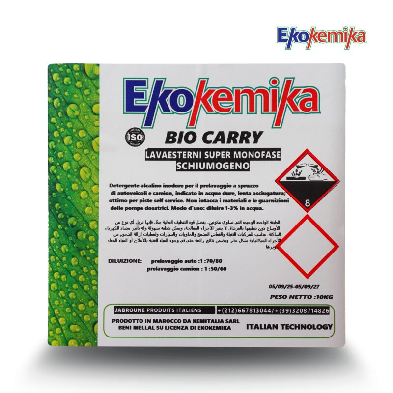 Ekokemika BIO CARRY est un détergent alcalin monophase moussant, spécialement formulé pour le prélavage par pulvérisation des voitures et des camions. Il élimine efficacement les salissures routières tout en respectant les matériaux et les surfaces sensibles. Poids net : 10 kg.